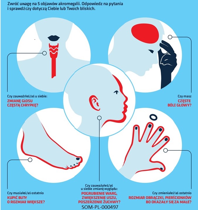 Jak podkreśla prof. Marek Ruchała do niepokojących zmian, na jakie należy zwrócić uwagę, zalicza się: zmiana rozmiaru dłoni i stóp, powiększenie żuchwy, które skutkuje m.in. pojawieniem się szpar między zębami, powiększony język, wydatne łuki brwiowe, zauważalnie szerszy nos, czy zmiana barwy głosu. Ponadto chorzy często skarżą się na bóle głowy, bóle stawów, wzmożoną potliwość, uporczywe chrapanie, zaparcia i bóle brzucha. Może nawet dojść do zaburzenia pola widzenia oraz, o czym nie zawsze chorzy chcą mówić głośno, spadku libido i problemów ze współżyciem.